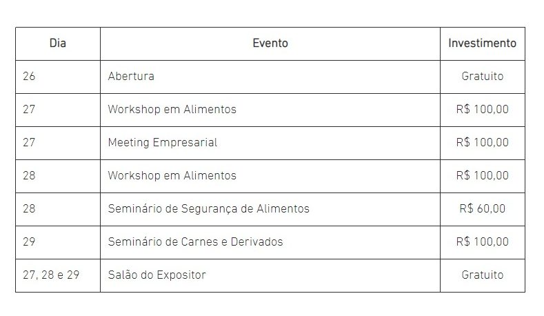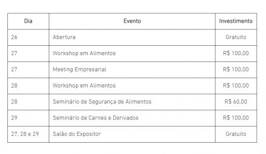 Confirmada para os dias 26, 27, 28 e 29 de abril, a 4ª edição da Jornada Técnica do Setor Alimentício (AlimentaAção) está com inscrições abertas. Os interessados em acompanhar as palestras, painéis e debates que abordarão qualidade, inovação, pesquisa, desenvolvimento e legislação podem garantir sua participação no site www.jornadaalimentaacao.com.br. Composta pelo XIX Workshop em Alimentos (27 e 28), III Meeting Empresarial (27), Seminário Segurança em Alimentos (28) e II Seminário de Carnes (29), a programação conta com mais de 30 atividades e o valor do investimento diário varia entre R$ 60 e R$ 100. A solenidade de abertura (26) será gratuita.