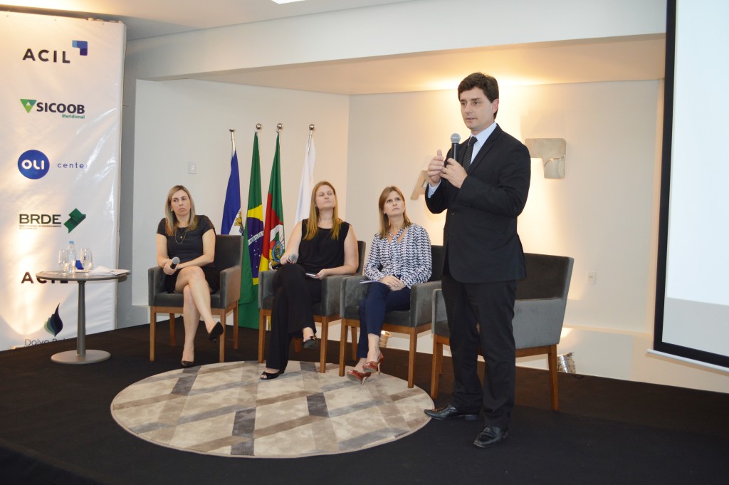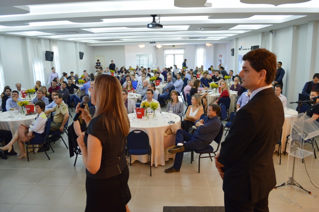 “O que buscamos é austeridade, planejamento e desenvolvimento para a nossa cidade. Estas três palavras sintetizam a nossa preocupação como gestão pública. É gratificante poder compartilhar isto com vocês. Estamos aqui para trabalhar pela nossa Lajeado e fazer isto da melhor maneira possível para que a qualidade de vida de cada um de nós seja cada vez melhor.” A afirmação foi feita pelo prefeito de Lajeado, Marcelo Caumo, que palestrou na reunião-almoço (RA) desta quarta-feira (25.04) promovida pelo Fórum das Entidades Empresariais e Sociais de Lajeado. A exposição, intitulada “O futuro é agora – um olhar para 2018”, teve a presença de cerca de 130 lideranças empresariais, comunitárias e políticas. A apresentação também contou com a presença da vice-prefeita Gláucia Schumacher. Juntos, apresentaram as principais projeções para o município de Lajeado em 2018, além de abordar temas como prestação de contas, atualização do plano diretor e demais ações e projetos que serão implementados no segundo ano do mandato.