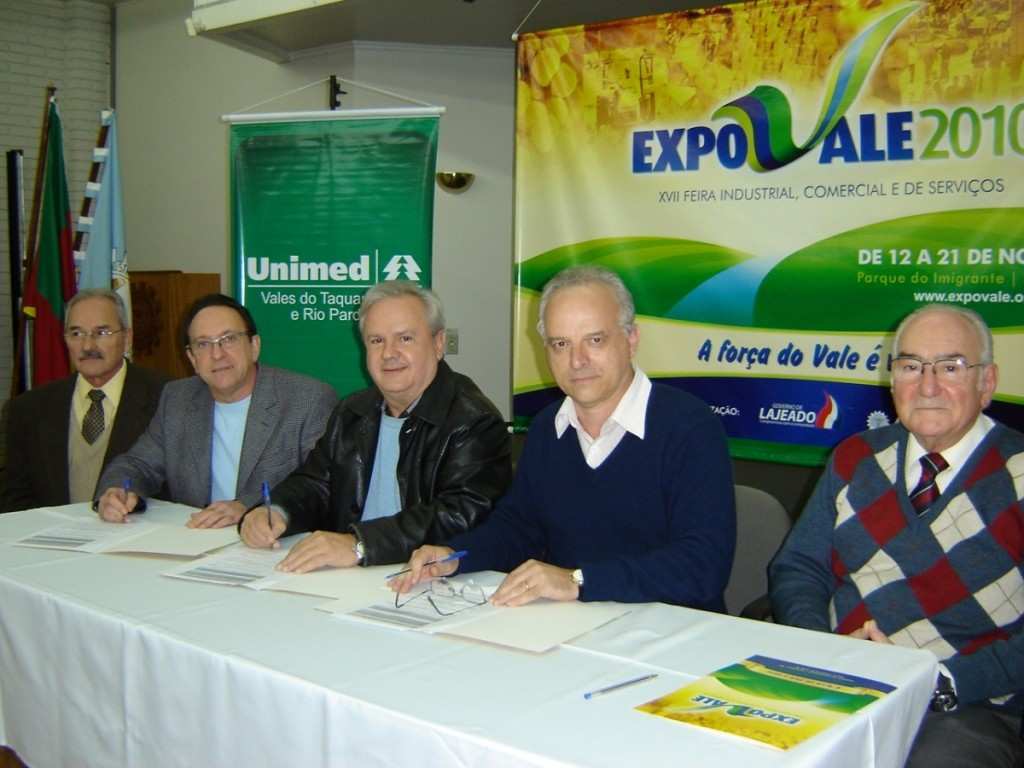 Lajeado – A Expovale 2010 terá o apoio da Unimed Vales do Taquari e Rio Pardo. O contrato de formalização de apoio foi assinado nesta quarta-feira (19/05) na sede da Associação Comercial e Industrial de Lajeado (Acil). O ato contou com a presença do presidente da Acil, Valmor Scapini; e dos representantes da Unimed VTRP, presidente Carlos Antonio da Luz Rech; vice-presidente, Aldo Pricladnitzki; diretor de Marketing, Paulo Roberto Jucá; e assessor de Relacionamento com Cliente, Sérgio Bertoglio.